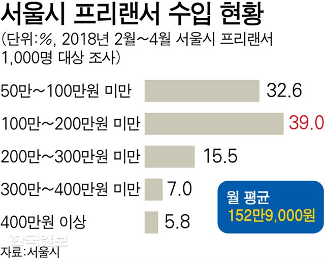 우리나라에도 많은 프리랜서가 많지만 프리랜서 3명 중 1명이 한 달 평균 수입이 100만원이 안되는 것으로 나타났습니다. 또한 월 평균 수입이 50만원에도 못 미친다는 응답자는 14.1%였습니다.
